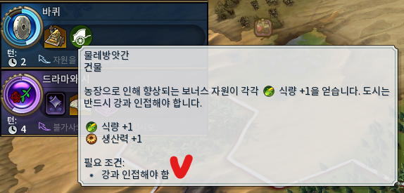 상업 중심지의 경우 강과 인접하면 보너스 +2를 받게 되는데 거기에 도심지까지 있다면 더 많은 보너스를 받을 수 있다.
